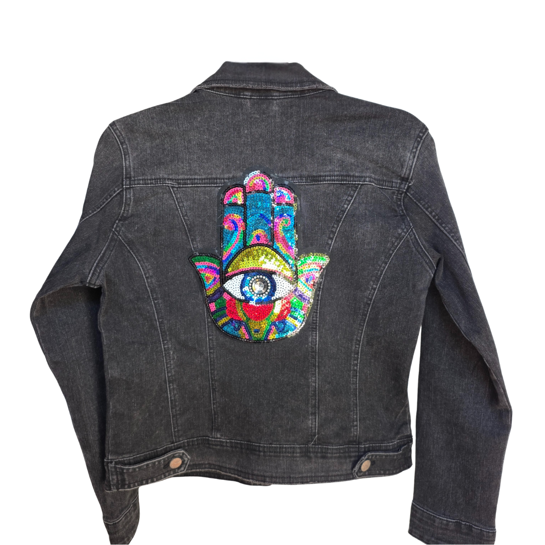 La Chamarra de Mezclilla Negra - La Sofia está intervenida a mano con un espectacular parche de lentejuelas multicolor en forma de mano de Hamsa, símbolo ancestral de protección, energía positiva y equilibrio. Cada detalle refleja fuerza, intención y un estilo auténtico que no pasa desapercibido.