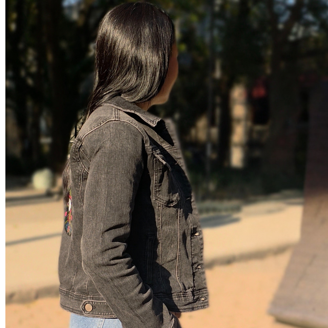 Su mezclilla negra de lavado vintage aporta un look urbano y versátil, mientras que el diseño trasero convierte esta prenda en una verdadera pieza protagonista. Ideal para mujeres que buscan prendas únicas, con significado y personalidad.