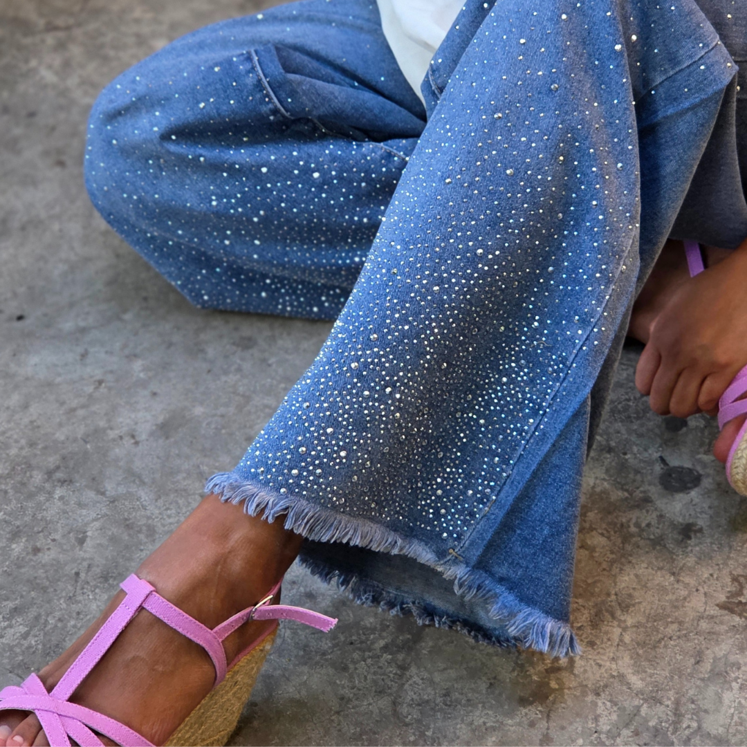 Estos jeans wide leg están diseñados para robar miradas. Con un detalle de pedrería en degradado que aporta brillo sutil y elegante, son la pieza statement perfecta para elevar cualquier outfit sin perder comodidad.